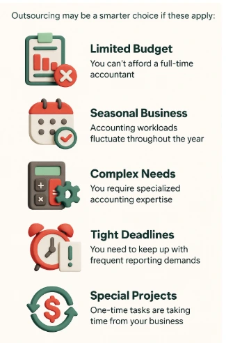 When these signs appear, it’s not just an operational issue—it’s a signal that your financial foundation needs expert support. Outsourced accounting gives small businesses and Online Business owners the structure, insights, and strategic clarity that are hard to achieve with a solo in-house hire.