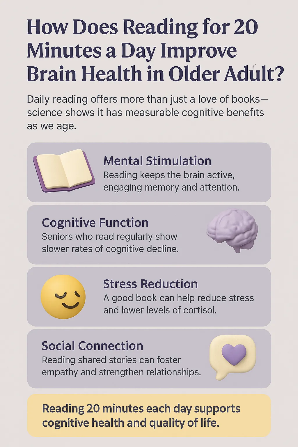 “In over two decades of working with older adults in cognitive wellness programs, one truth has remained constant — the brain thrives on challenge and consistency. Reading for just twenty minutes a day might seem modest, but it’s one of the most effective ways to keep neural networks active and resilient. Each page read is like a micro-workout for memory, focus, and emotional balance — small, daily repetitions that build lasting brain strength over time.”