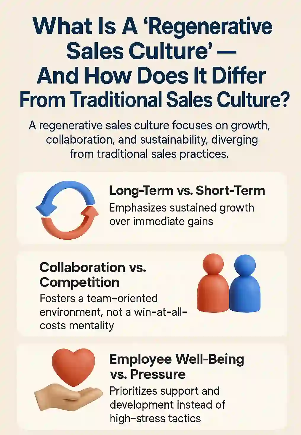 - Regenerative sales culture supports trust, well-being, and long-term performance.